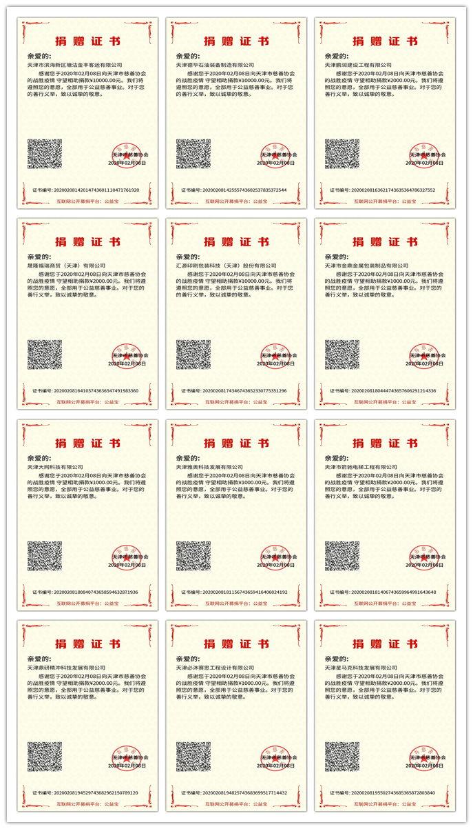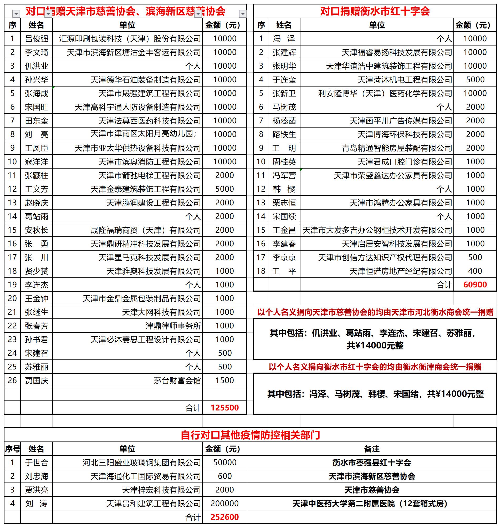 疫情无情人有情,支持前线献爱心。在疫情防控的紧要关头,衡水商会号召企业发扬关心国家、乐于奉献的优良传统,以 “抗击疫情、匹夫有责”的强烈责任感,捐资捐物支援抗击疫情第一线。商会会长冯泽、永久会长吕俊强和其他商会领导积极带头,在短短四天内,衡水商会48家商会单位先后捐赠资金及紧缺物资约计43.9万元;其中企业直接捐赠有关疫情防控部门、市慈善总会、疫情防控医院等捐献的善款与物资约计25.26万元;通过天津市衡水商会平台捐赠资金共18.64万元。这些已经分别捐助给天津市慈善协会、滨海新区慈善协会和河北省衡水市红十字会,并分别由这些单位转往武汉疫情急需地区。