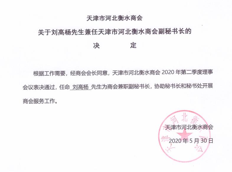 天津市河北衡水商会关于刘高杨先生兼任商会副秘书长的决定
